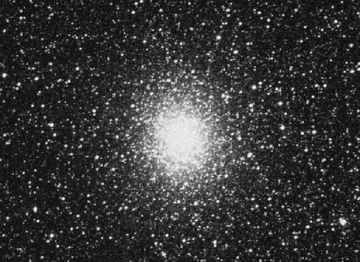 78k JPEG M12 (NGC6218, Bennett 80) is a bright (mag. 6.6) globular located 3.3° NW of M10. At 15', it is almost M10's twin, but it is more irregular in shape. Note the tiny patch of nebulosity in the lower right of the image. From the Digital Sky Survey.