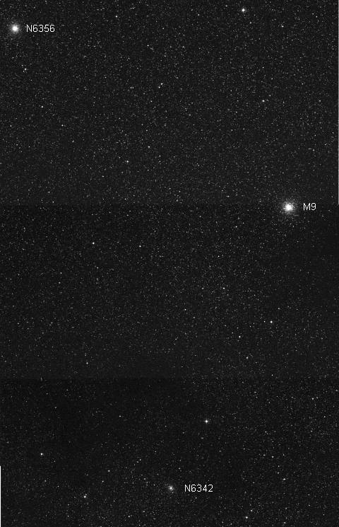 NGC6356 (Bennett 93) lies 33' north-east of M9. Described as very bright (mag. 8.4), quite large (7.2'), and brightening very gradually but very much toward the middle, this is another "well resolved," cluster. It contains, Dreyer states, stars of magnitude 20. Magnitude estimates at such extremes were notoriously inaccurate in the 18th and 19th centuries. Modern estimates yield magnitude 16 stars (photographic). In practice this means the cluster looks vaguely grainy in a 12" to 13". NGC6342 is located SSE of M9. Dreyer says it is quite bright (mag. 9.9), fairly small (3'), little extended, and "easily resolvable." Steve Coe "resolved" two stars in a 13".