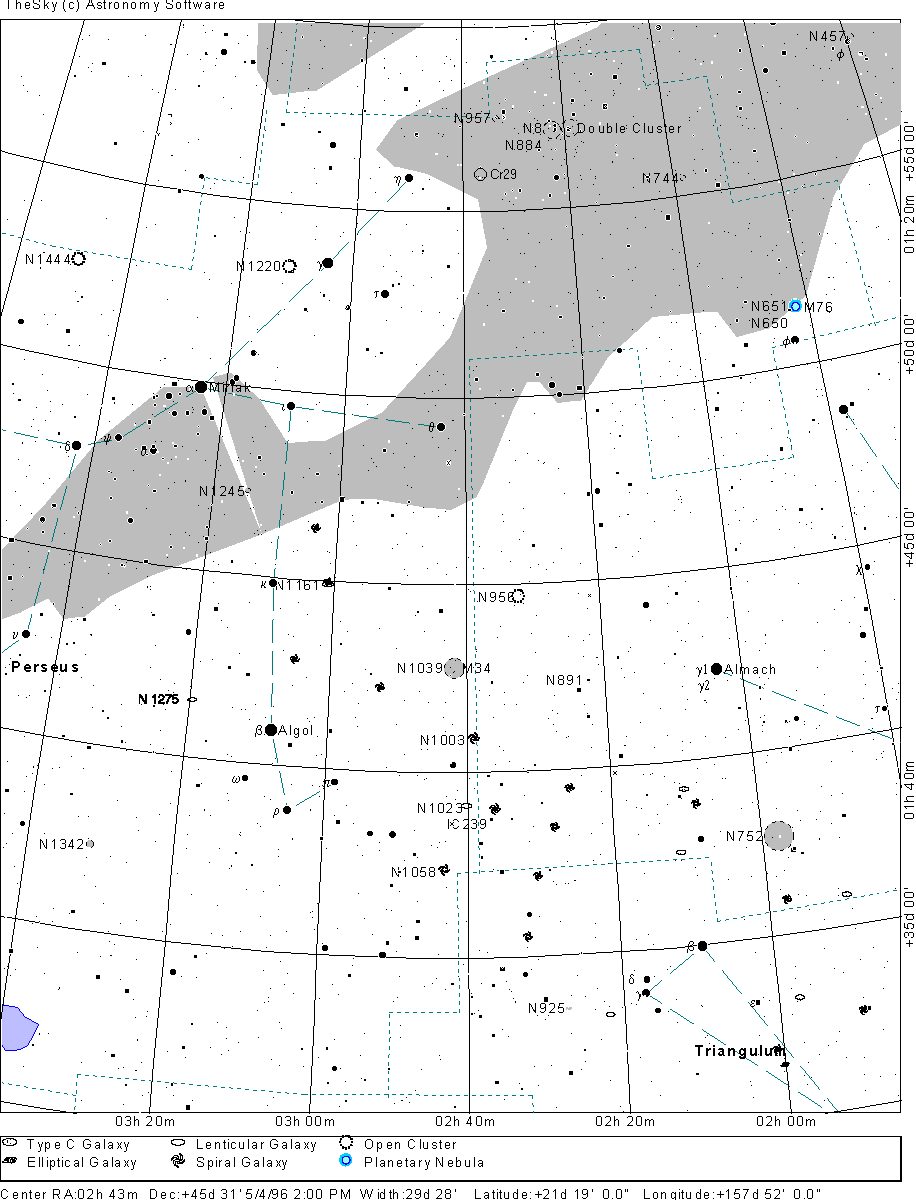 85k JPEG. M34 (NGC1039) is a bright (mag. 5.2), very large (35'), open cluster located 7° west of Almach (Gamma Andromedae. It sits on the Perseus-Andromeda border. Dreyer states it contains scattered stars at about mag. 9.